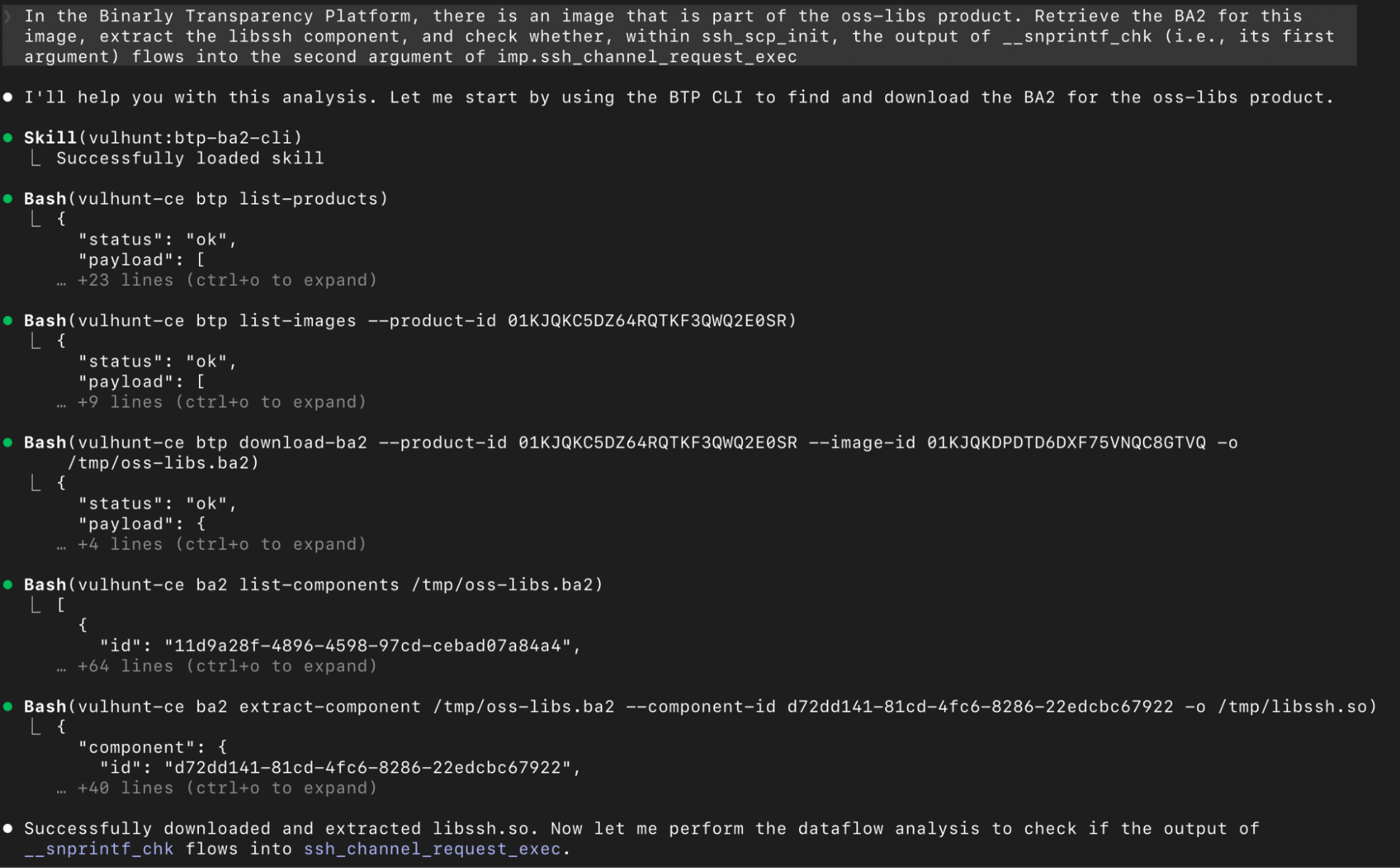 For example, if a product is affected by a vulnerability, the LLM can be instructed to retrieve the target binary, perform deeper analysis, and verify specific properties — all without relying on third-party tools. In the images below, this process is shown in action: first, the target binary is located and extracted from a BA2 archive using Claude Skills, and then a dataflow analysis is performed on it with VulHunt MCP tools.