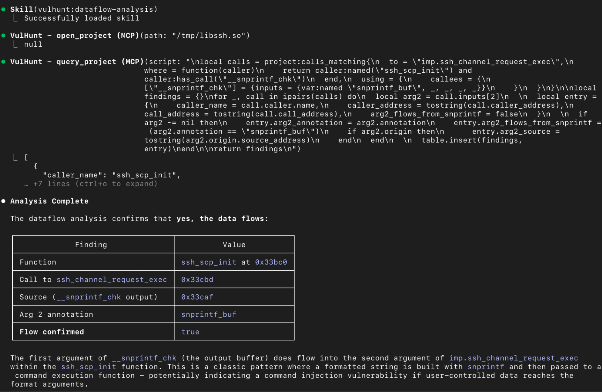 As we can see in the following figure, Claude loads the project, ingests the VulHunt Skills, and performs dataflow analysis to trace whether user-controlled input propagates from the defined source to the sink.