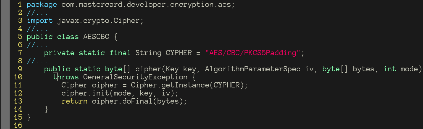 In this particular piece of code, we see that the method `cipher` of the class `AESCBC` uses the `javax.crypto.Cipher` class from the JDK to perform a cryptographic operation using the AES algorithm. In order to identify this particular instance of a cryptographic operation in a JAR containing this class, we do several things behind the scenes: