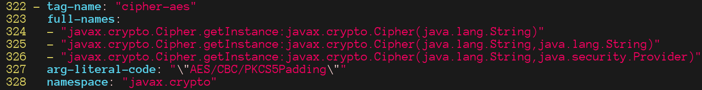 We have identified 6 code patterns used in cryptographic operations implemented in the most popular cryptographic libraries for the JVM, and our rule format allows us to detect every instance and permutation of these cryptographic APIs. Some examples of the patterns used in the instantiation of the objects performing cryptographic operations are: