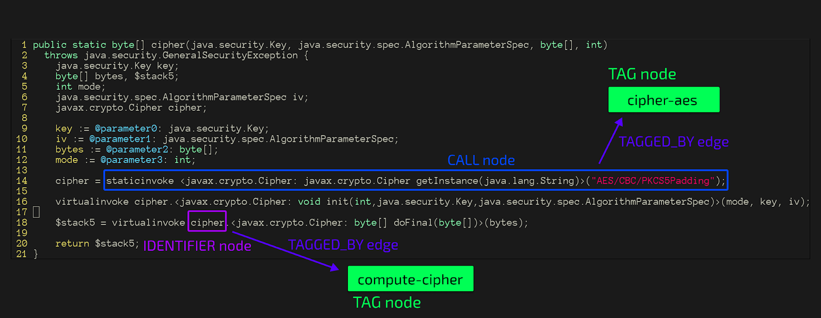 In order to detect cryptographic algorithm usage accurately, we tag nodes in the CPGs generated from Java bytecode and run a number of dataflow analyses on the graph, all based on rules we defined for various popular cryptographic libraries. The general pattern is: tag the source (the call which instantiates the object performing the cryptographic operation), tag the sink (the instance of the object performing the cryptographic operation at the call site which triggers the operation), and finally find a dataflow between the source and the sink (i.e. the conclusion).