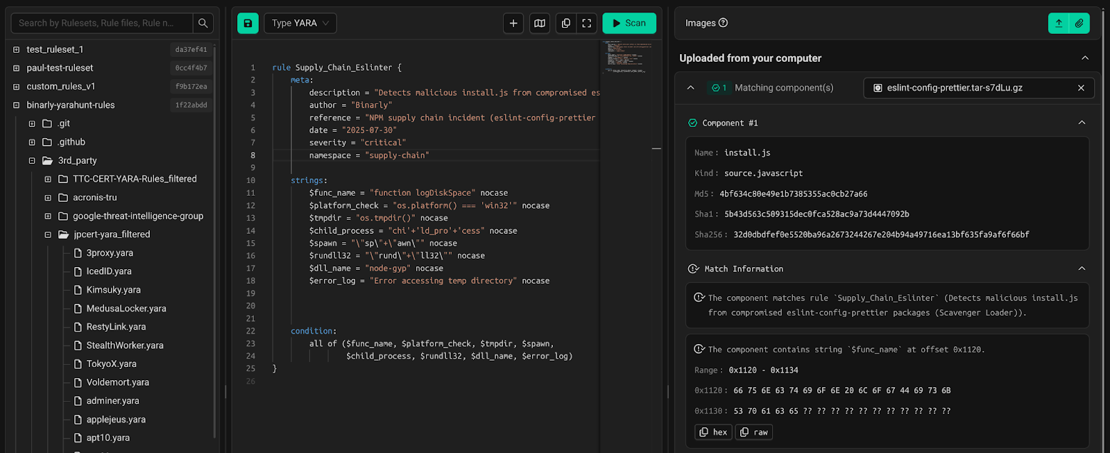 Some Binarly customers are already leveraging the platform for TPRM and third-party software procurement processes within enterprise environments, where these enhanced YARA capabilities provide a powerful advantage, allowing seamless integration of existing threat intelligence feeds into their analysis workflows and strengthening their overall detection and third-party risk visibility strategy.