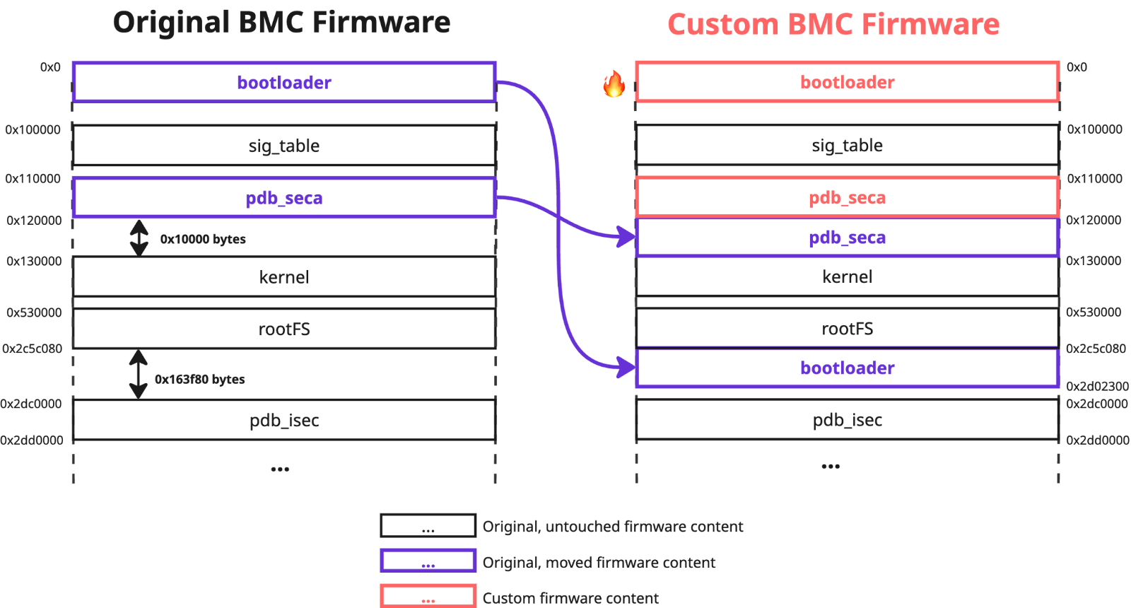 However, these constraints did not prevent us from replacing the firmware bootloader with a custom one, and moving all the genuine signed image content to one of the allowed offsets – `0x100000`. We also used a whitelisted region name `bootloader` to define it in the modified `fwmap` table, that we again located before the the original one, as part of the `pdb_seca` region: