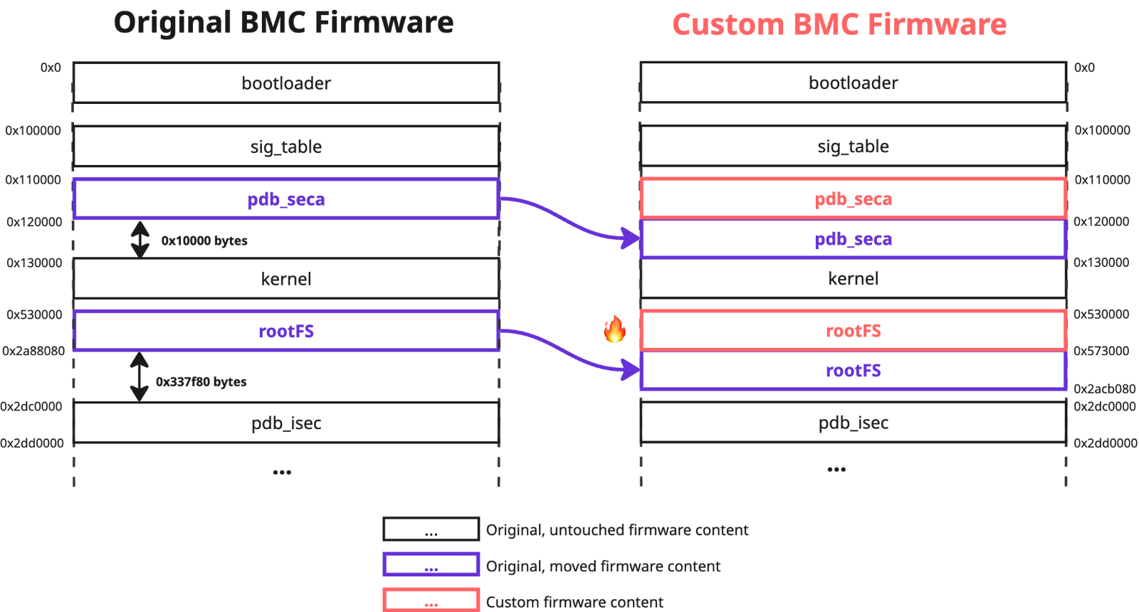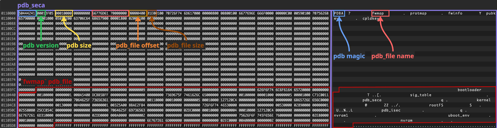 offset: 0x0110000, size: 0x0000001, is_signed: false - nvramFirst, we placed the original contents of the `bootloader` and `pdb_seca` regions to the unreserved firmware space at offsets `0x2c5c080` and `0x120000` respectively. We also placed `pdb_seca` region containing our custom `fwmap` table to the offset `0x110000` to avoid triggering the first validation check (remember that the "used pdb_seca offset” is located by searching for the first “PDB” instance containing the `fwmap` entry in the uploaded firmware content). To comply with the second validation check, we changed the offset of the `nvram` region to `0x110000` and its size to `0x1`. As its `is_signed` flag is `false`, the content of this region did not affect the image cryptographic signature verification process.
