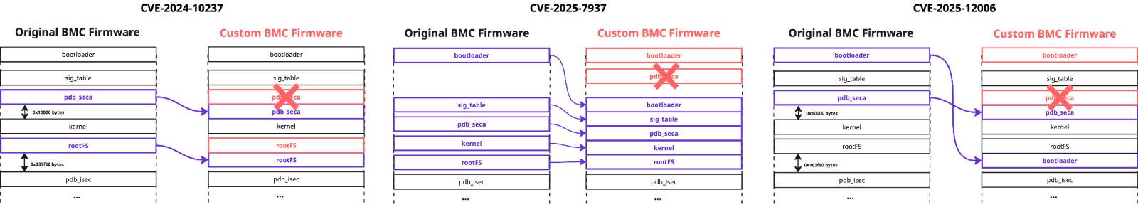 The next sections will reveal the details of CVE-2025-12006 and CVE-2025-12007. To ensure smooth reading, we will provide a quick recap of the related firmware validation mechanisms and issues previously found in them before discussing each of the vulnerabilities. For CVE-2025-12006, validation is based on processing the content of the `fwmap` table, whereas for CVE-2025-12007, it is based on parsing the `sig_table`.