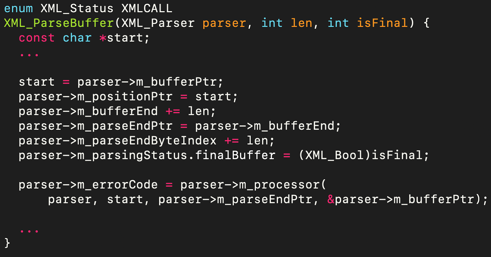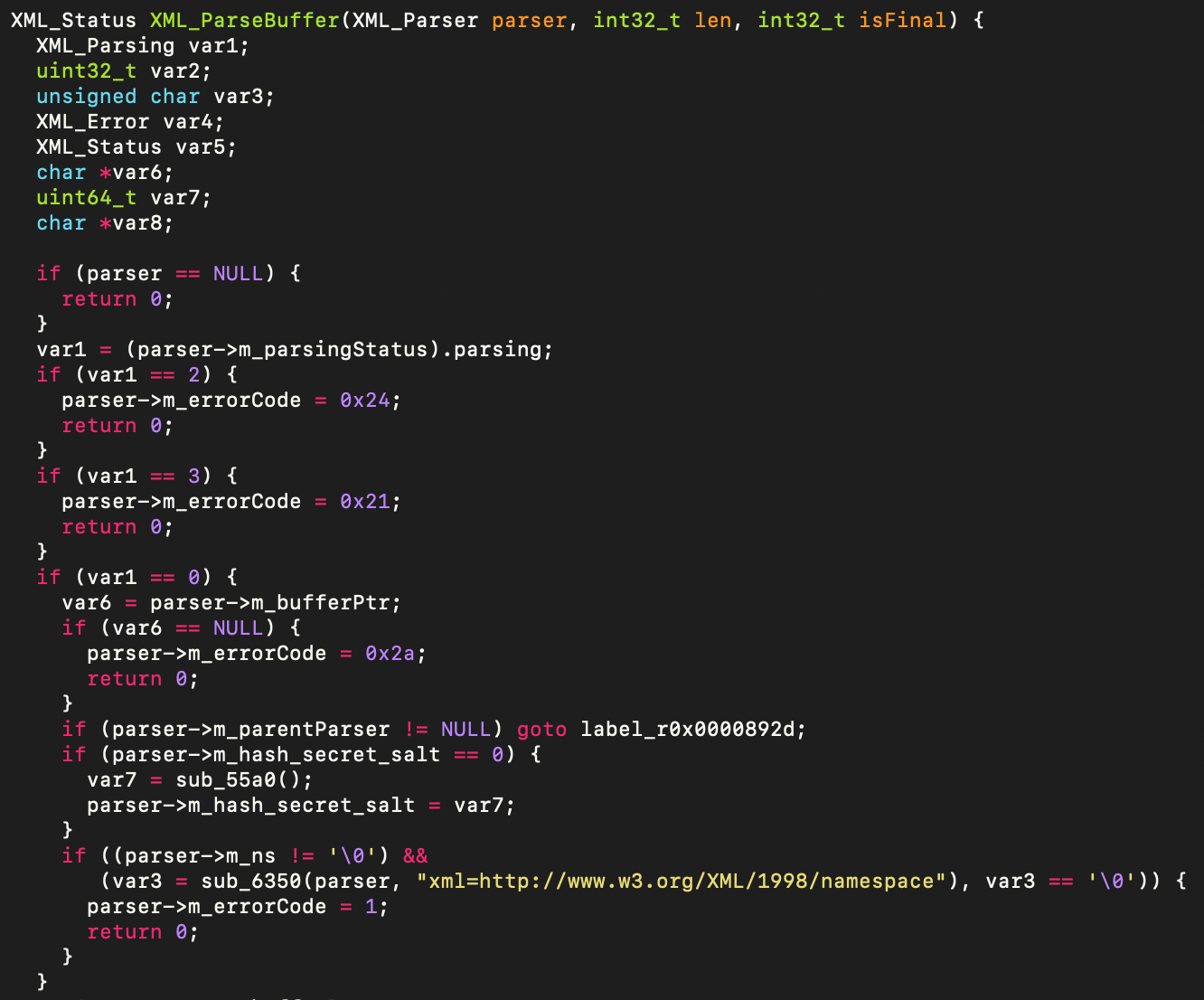 For example, consider CVE-2023-52425: a processor function (parser->m_processor) is called without any guards, leading to a denial-of-service (DoS) via quadratic parsing behavior. Searching at the decompiled code level makes it straightforward to express and detect this pattern, even if the surrounding code is complex or slightly modified from known vulnerable variants.