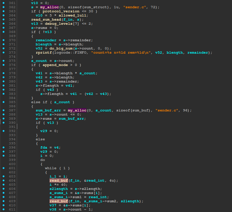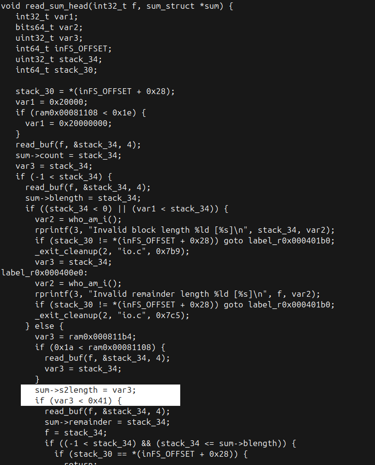 `send_file` function.`my_alloc`.`read_buf`, which copies `s2length` to `sum->sum2`.We should also make sure `SUM_LENGTH` is indeed 16, but since this was the case for all vulnerable binaries we analyzed, we’ll skip this check for the sake of simplicity.