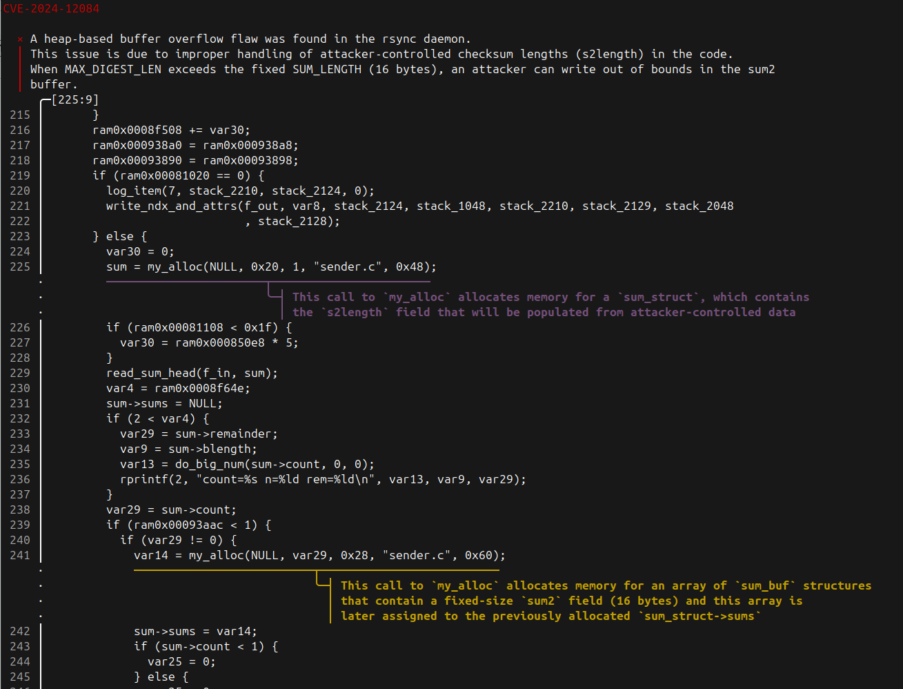 message = "A heap-based buffer overflow occurs here as `sum_struct.sums[i].sum2` is\n16 bytes long and it's populated with `sum_struct.s2length` bytes, which is\nattacker-controlled and not properly checked"