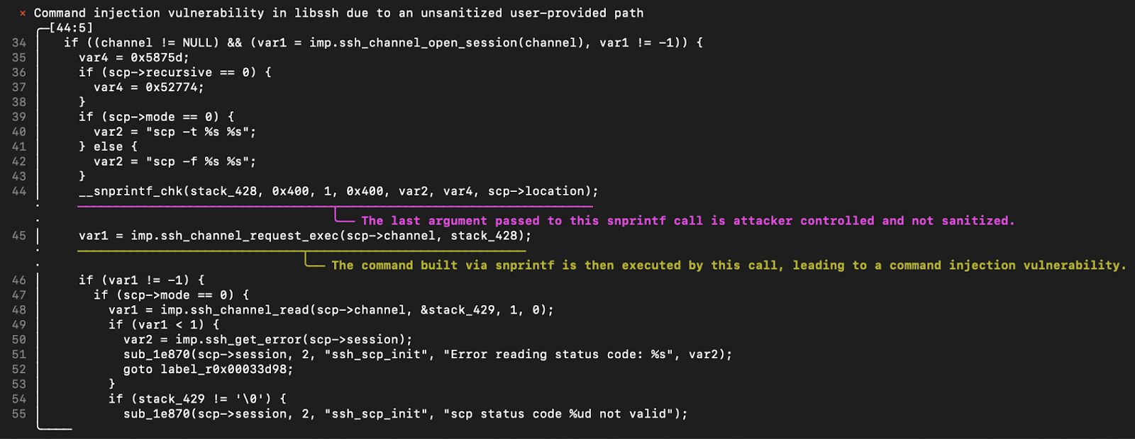 For example, the screenshot below shows a decompiled function with annotations highlighting a detected vulnerability: