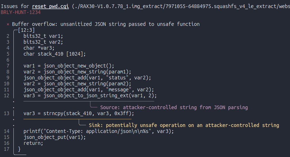 The main part of the result is the annotation within the evidence block. This allows VulHunt to mark the exact instruction addresses for the source and sink, embedding the security finding directly into the decompiled code. This drastically accelerates the triaging and explanation of the vulnerability. The rule is now ready and can be used to automatically check any router firmware and discover new vulnerabilities across hundreds of binaries.